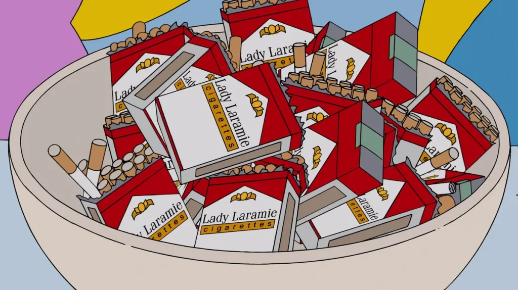 Incidentally, the second most popular cigarettes, immediately following Morley, are Laramie, an analog of Marlboro in the “Simpsons” universe. The popularity of the brand, perhaps, contributed to the popularity of the series itself, which has not lost its fans for many years. Laramie, although not similar to Malboro by name, but accurately enough, for the style of the cartoon universe, copies the graphic image of the pack. Plus, this brand has many varieties in the series, from Laramie 100’s to Laramie Extra Tars, there’s even an electronic version of Larami-e.